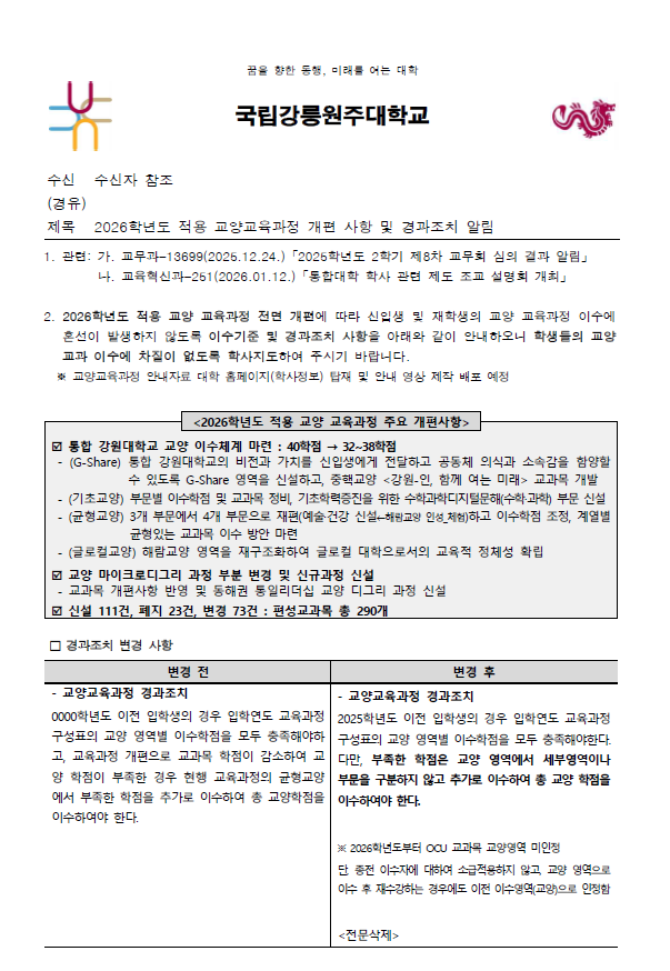 - 이수영역을 못채웠어도 입학연도 교양이수학점의 총 학점만 채우면 됩니다. ※ 모두 소급적용